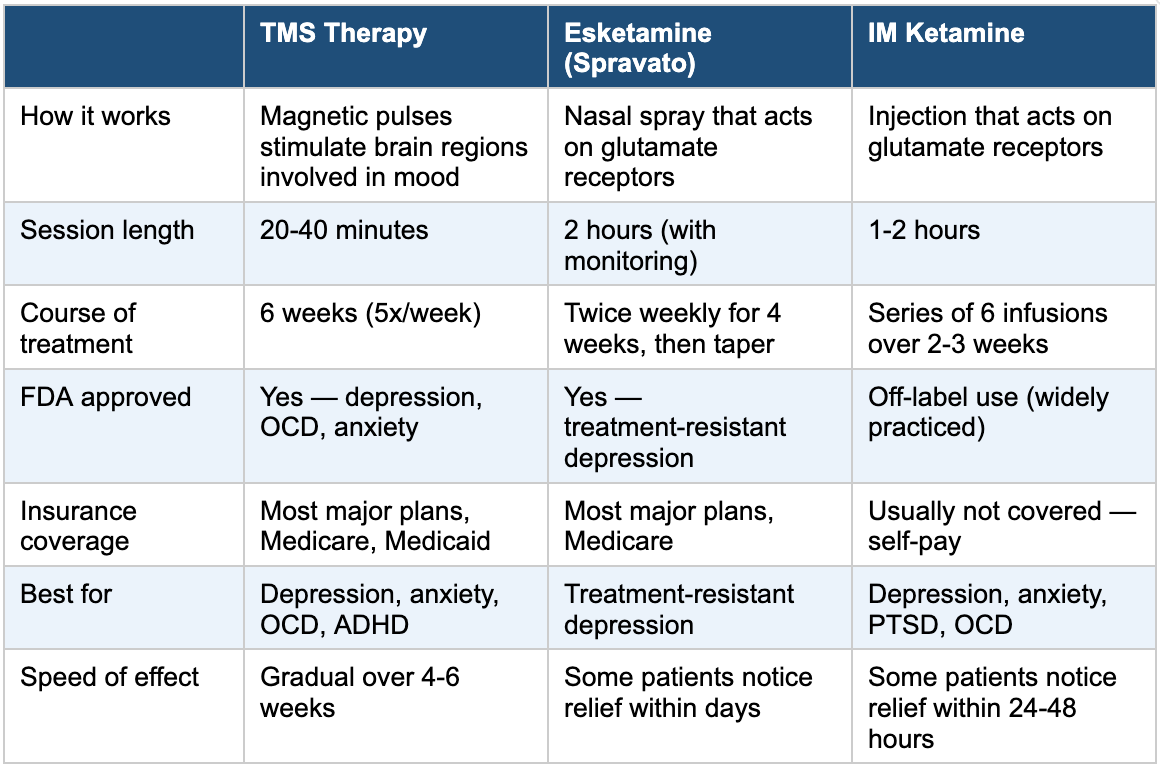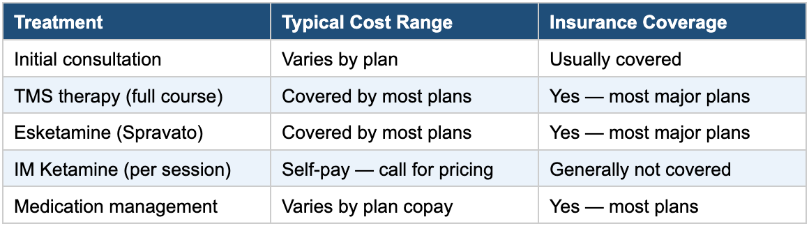 Coverage varies by treatment type and individual plan. TMS therapy and esketamine (Spravato) are covered by most major plans when medical necessity criteria are met. IM ketamine is typically not covered by insurance and is self-pay.